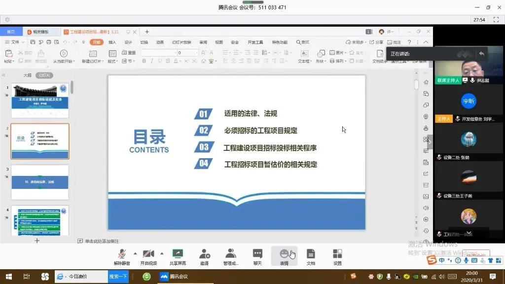 3月31日(ri)20時(shi)整,由尹(yin)總(zong)主講(jiang)的“工(gong)程建設項目招(zhao)標法規及實務(wu)”遠程視頻培訓(xun)會議開講(jiang)了。