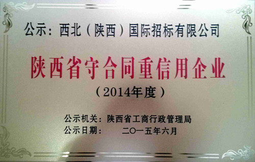 祝賀我公司榮獲2014年度陜西省“守合同重信用”企業。根據國家工商總局和陜西省工商行政管理局通知文件要求,公司申報并通過審核,現已在陜西日報和陜西省工商行政管理局網站向社會公示。