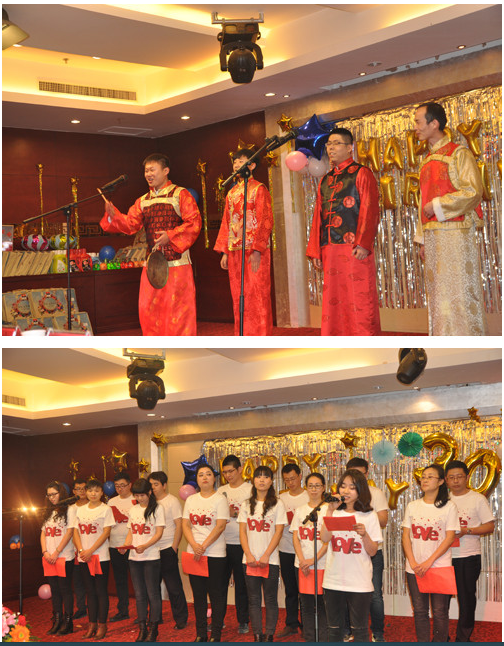 主持人侯潤澤 、常樂宣布演出開始,辦公室張琦以一曲慷慨激昂的男聲獨唱《中國人》首先登場。緊接著設備部的小合唱《我相信》和《明天會更好》點燃了全場觀眾的情緒,大家被團結和積極向上的氛圍感染。造價部胡建輝、謝新、李珂、張翔宇的三句半《說造價》用詼諧而生動的陜西方言道出了造價工作的艱辛與樂趣;楊大衛的小號表演優美動聽;詩朗誦《牽動造價舞動人生》則以高昂的情懷抒發了造價人對造價工作的熱愛。財務室常樂帶來的古典舞蹈《驚鴻舞》將觀眾帶入到一個優美而婉約的意境中;劉卿和李偉合作的小提琴吉他伴唱《當你老了》深情動人。工程部的小品《小璐超級訪問》和楊東峰的魔術《分不清左右》充分展現了年輕人的才華,包袱疊起,讓人捧腹不止。抽獎與游戲環節更是讓觀眾熱情高漲,八十位同志有幸在此環節中獲得一、二、三等獎。晚會最后以一曲《相親相愛》結束。