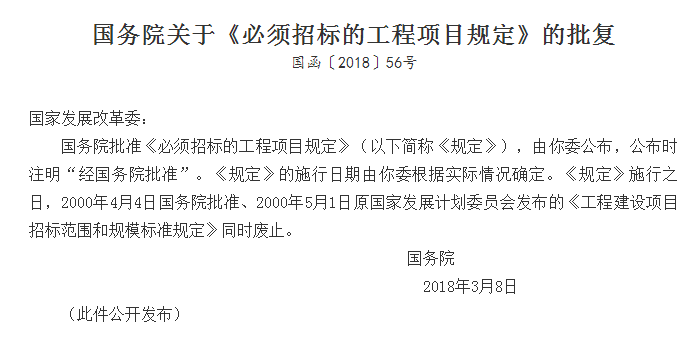 國務院批復《必須招標的工程項目規定》6月1日起實施