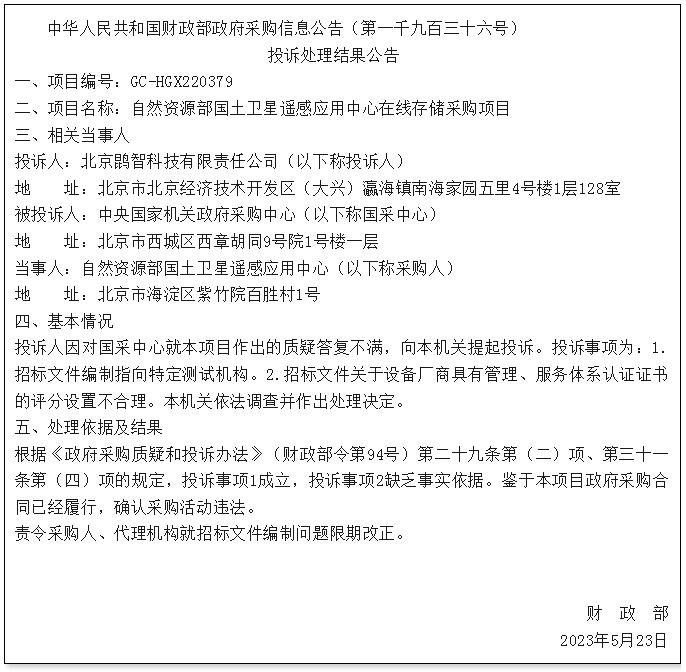 5月30日,財政(zheng)部發布1936號政(zheng)府采購處理意見(jian),涉(she)及項(xiang)目為自然資源部國土衛星遙感應用在線存儲采購項(xiang)目,預算 500 萬元。