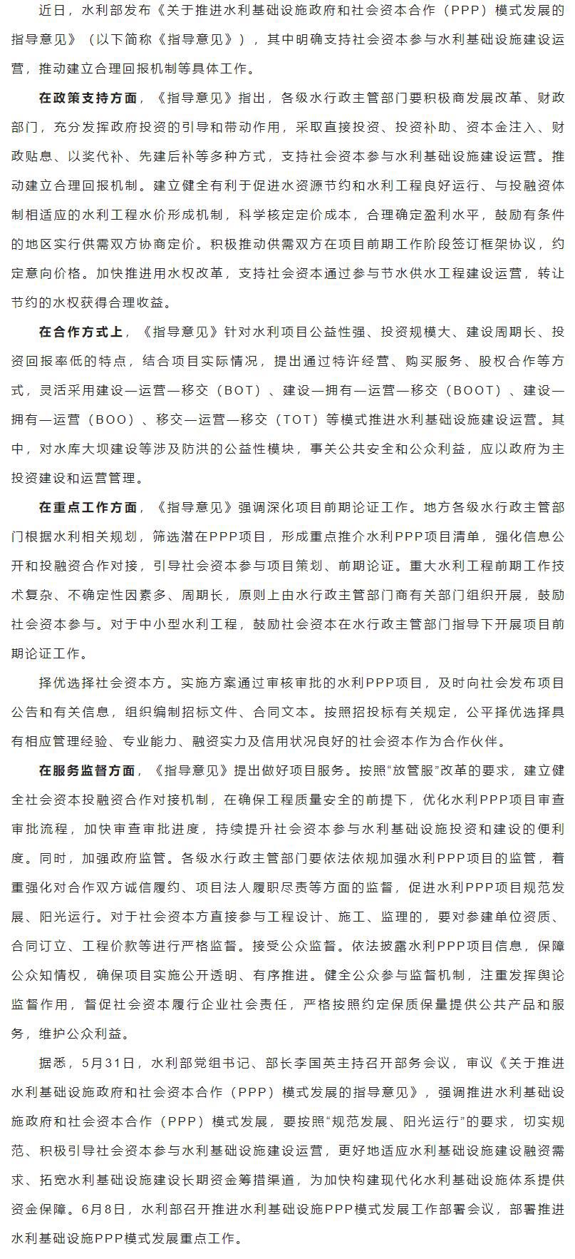 水利部|支持社會資本參與水利基礎設施PPP項目建設運營