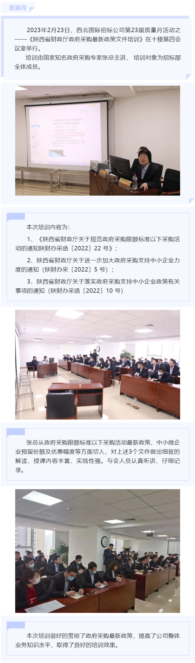 西北國際招標公司第23屆質量月活動之——《陜西省財政廳政府采購最新政策文件培訓》