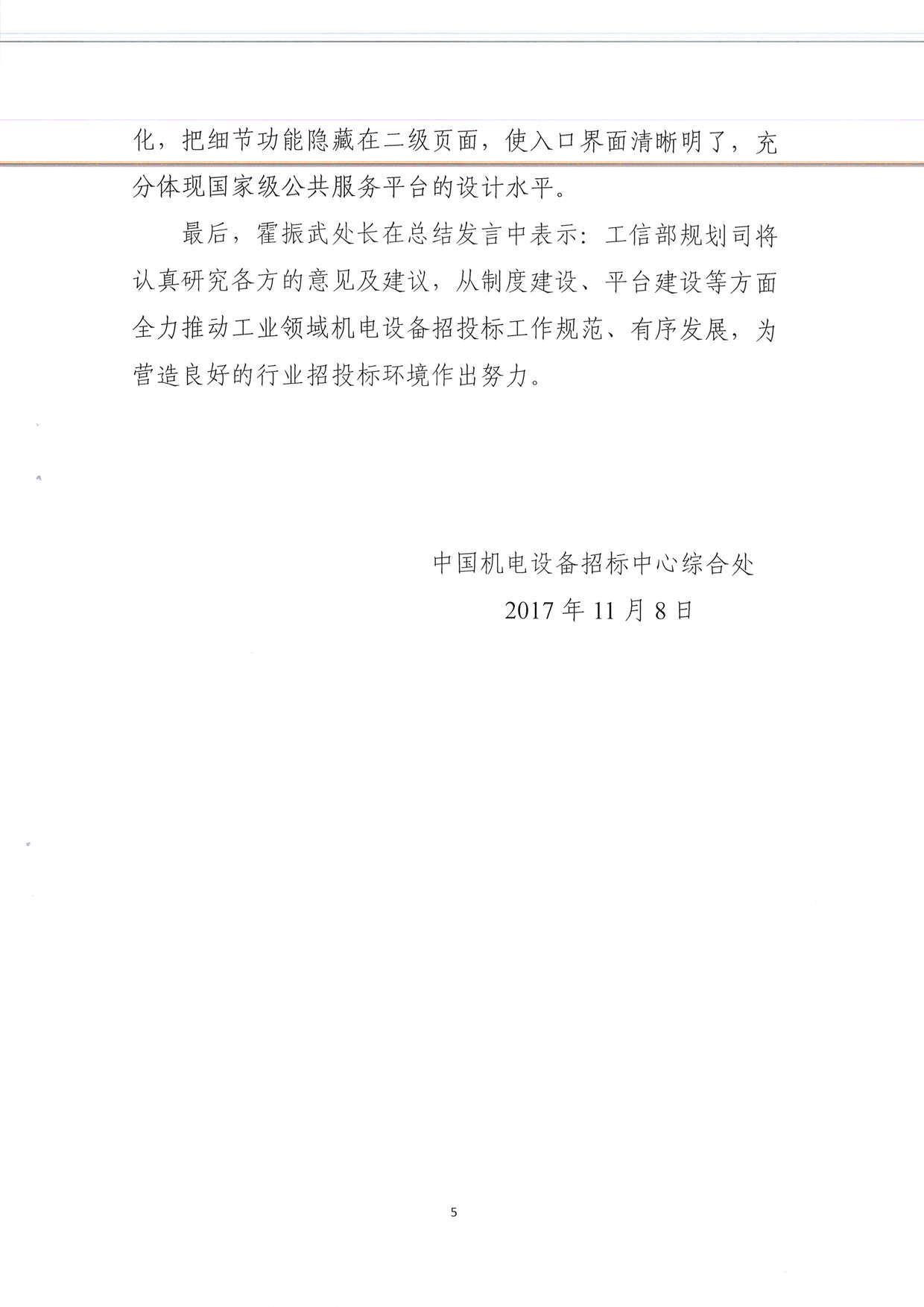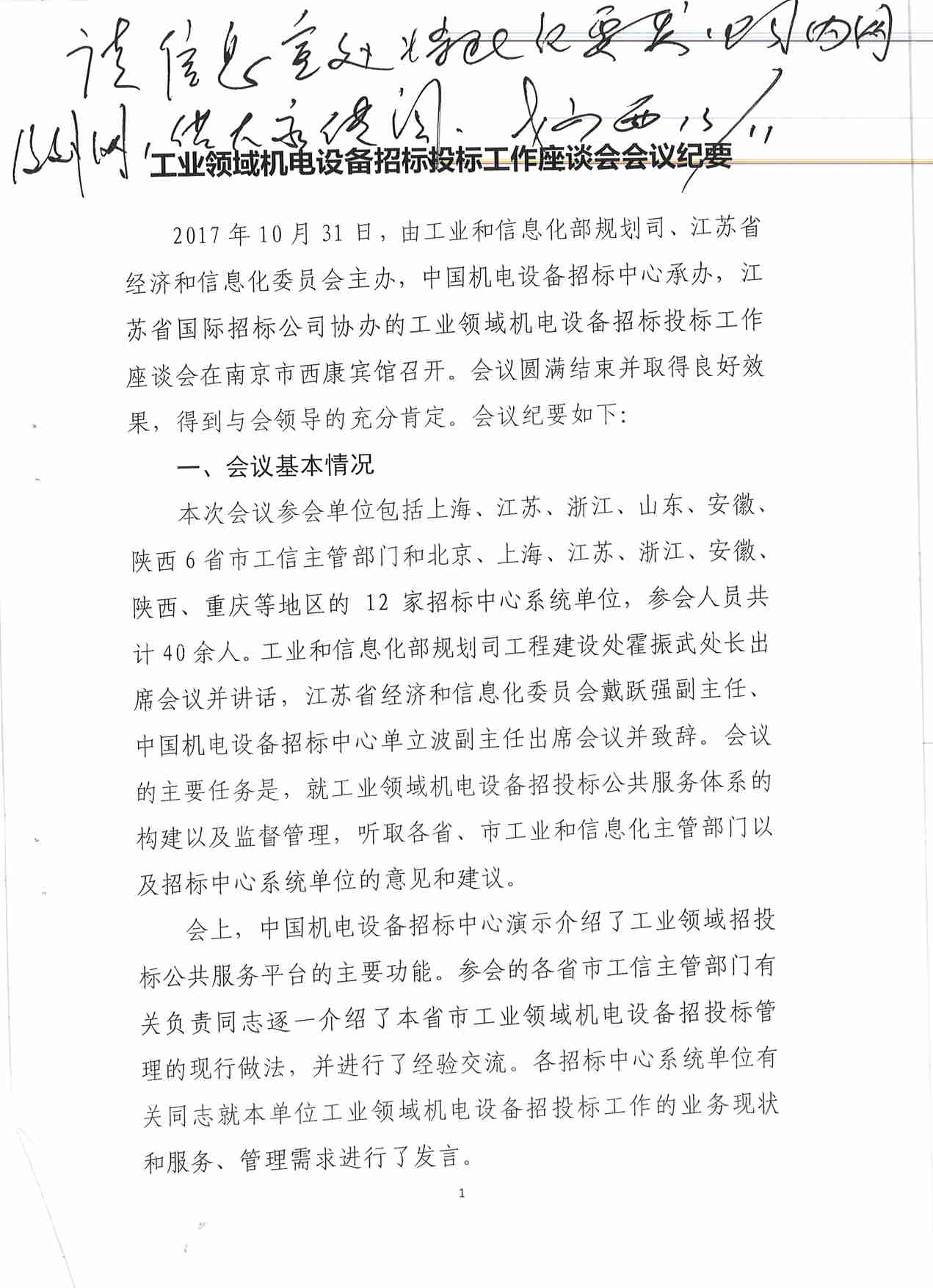 由工信(xin)部規劃司主辦,在南京召(zhao)開(2017年10月31日)的 “工業領域機電設(she)備招投(tou)投(tou)標工作座談會(hui)”《會(hui)議(yi)紀要》現(xian)已下發(fa)。全國6省(sheng)市(shi)工信主管部門和12家招標(biao)代理機(ji)構(gou)參加(jia)此次座談會(hui),我公司董(dong)事長總經理戈乃西(xi)受邀參加(jia)會(hui)議。