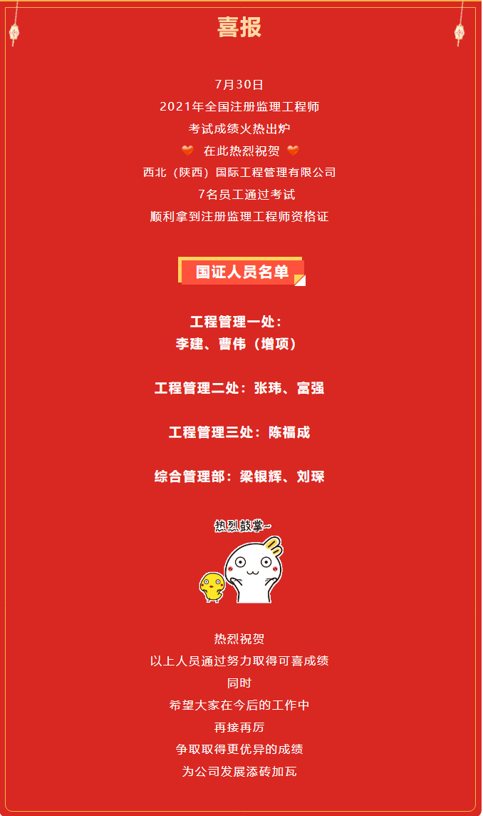 喜訊!西北(陜西)國際工程管理有限公司7人通過監理國證考試