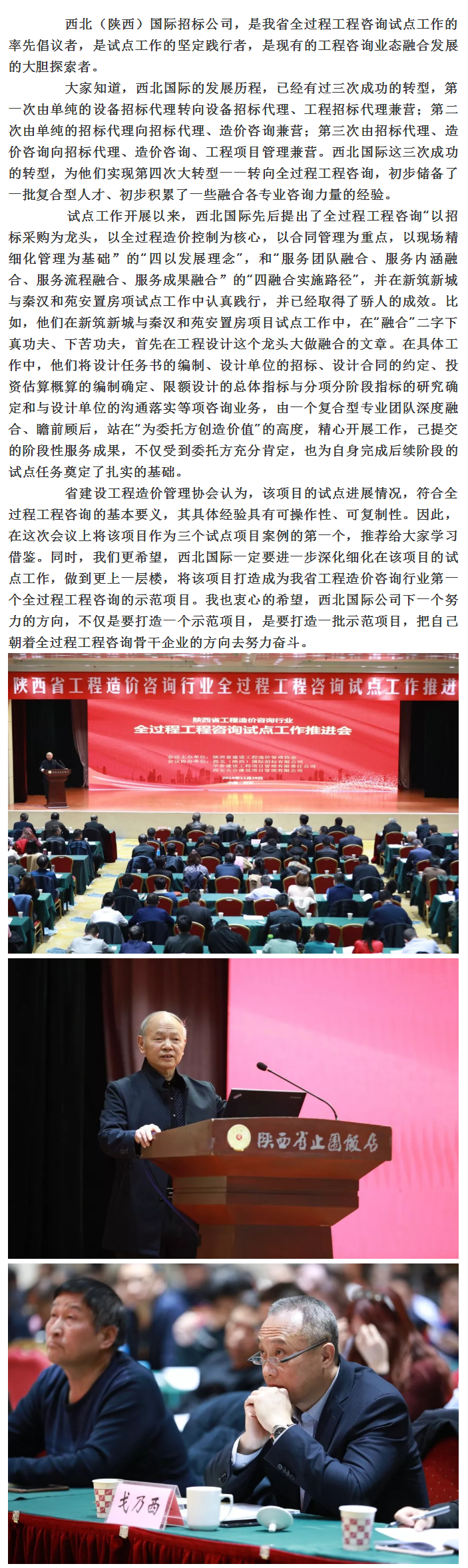 我公司在工程造價咨詢行業全過程工程咨詢試點工作推進會上獲陜西省建設工程造價咨詢協會會長彭吉新高度贊揚