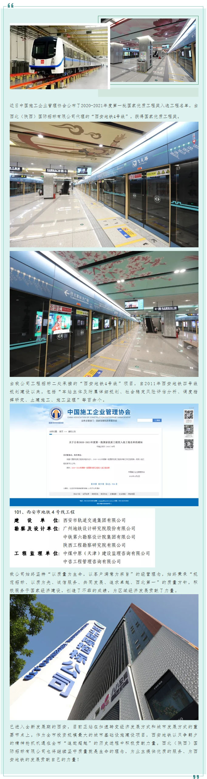 由西北國際招標公司代理的“西安地鐵4號線工程”榮獲國家優質工程獎