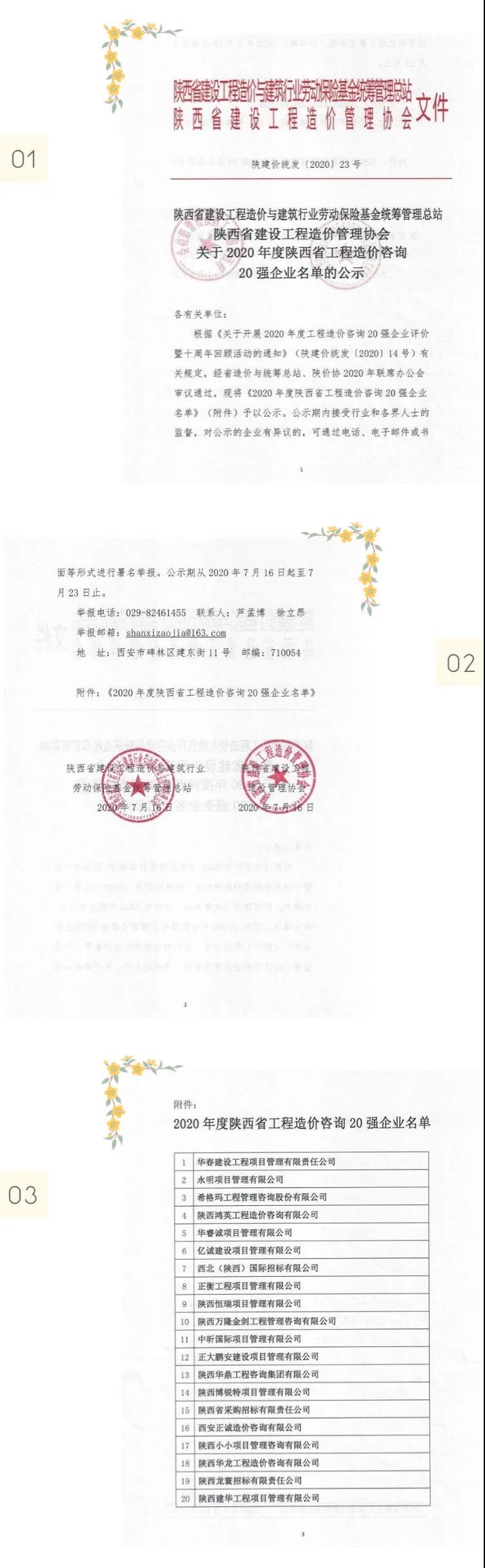 2020年7月17日,陜西省建(jian)設工程造(zao)價管理協會(簡稱陜價協)發布“關于2020年度(du)陜西省工程造(zao)價咨詢20強企業名單的公示(shi)”,西北(陜西)國際招標有限公司再次入(ru)圍,榮(rong)獲“第七名”。