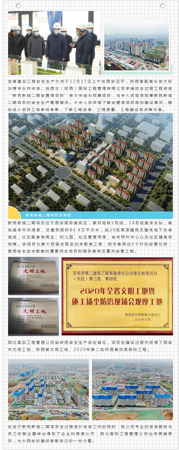 我公司承接全過程工程咨詢“新筑新城二期安置房項目”被全省建設工程安全生產大會選為觀摩項目,陜西省副省長徐大彤蒞臨參觀考察
