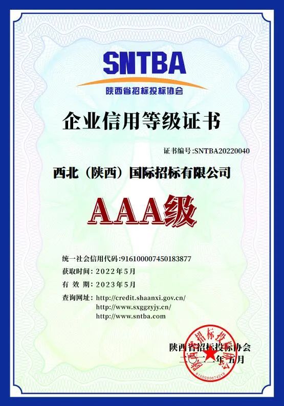 熱烈祝賀我公司榮獲2022年陜西省招投標協會《AAA級企業信用等級證書》