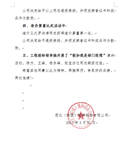 2017年度(du)質量月活動(dong),公司集(ji)中開展了(le):“ISO9001新版宣(xuan)貫”、“政府采購(gou)相關政策(ce)和法規的宣(xuan)講”、“審計工作的培訓”、“新員工入職系列培訓”、“造(zao)價制度宣(xuan)貫”;“政(zheng)(zheng)府采購政(zheng)(zheng)策考試”、“案例分析(xi)”、“造價算量比武”、 “模擬開標技術比武”; “假(jia)如我是部門經理”、“踐行公司企業文化一年來體會、心得演講”等一系列活動(dong)。