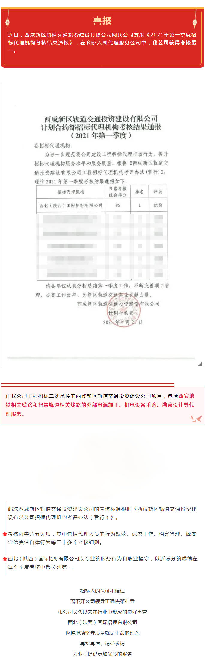 我公司獲西咸新區軌道交通投資建設有限公司《招標代理機構考核》2021年第一季度考核第一名