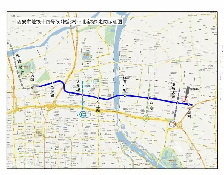 西(xi)安地鐵(tie)十四號(hao)線(最初規(gui)劃為(wei)十三號(hao)線)為(wei)東(dong)西(xi)走向,規(gui)劃東(dong)端起(qi)點為(wei)國際(ji)港務區窯村機場西(xi)側,跨灞河后抵(di)達北(bei)客站,與機場線貫(guan)通運營。一期工程為(wei)賀韶村到~北(bei)客站(不含),主(zhu)要(yao)為(wei)配合2021年西安(an)第(di)十(shi)四屆(jie)全運會建設。線路(lu)長度(du)約13.8km,依次(ci)沿向(xiang)東路(lu)-學府(fu)中(zhong)路(建材北路)-開發大道鋪設(she),共設(she)賀(he)韶村站~港務大道站~三義莊站(zhan)(新增(zeng))~雙寨(zhai)站~體育(yu)中心站~辛王路站~學府路(大學城)站~尚賢路站車站8座(不含北(bei)客站(zhan)),其中換乘站(zhan)3座,均(jun)為地下站(zhan),設一處停車場(賀韶村停車場),設主變電所1座(太華北(bei)路(lu)與學(xue)府中(zhong)路(lu)東北(bei)象限)。