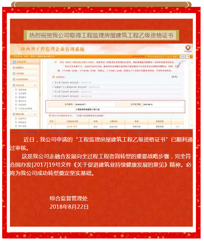 熱烈祝賀我公司取得工程監理房屋建筑工程乙級資格證書