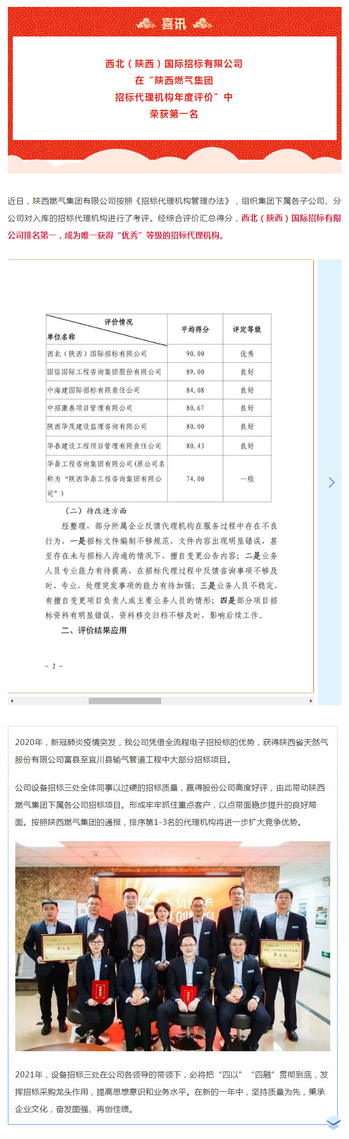 我公司在“陜西燃氣集團 招標代理機構年度評價”中 榮獲第一名