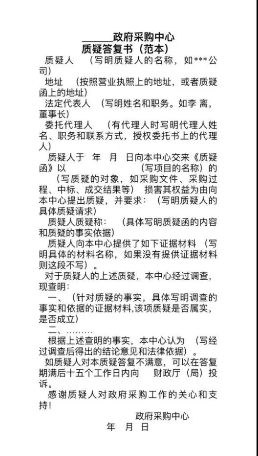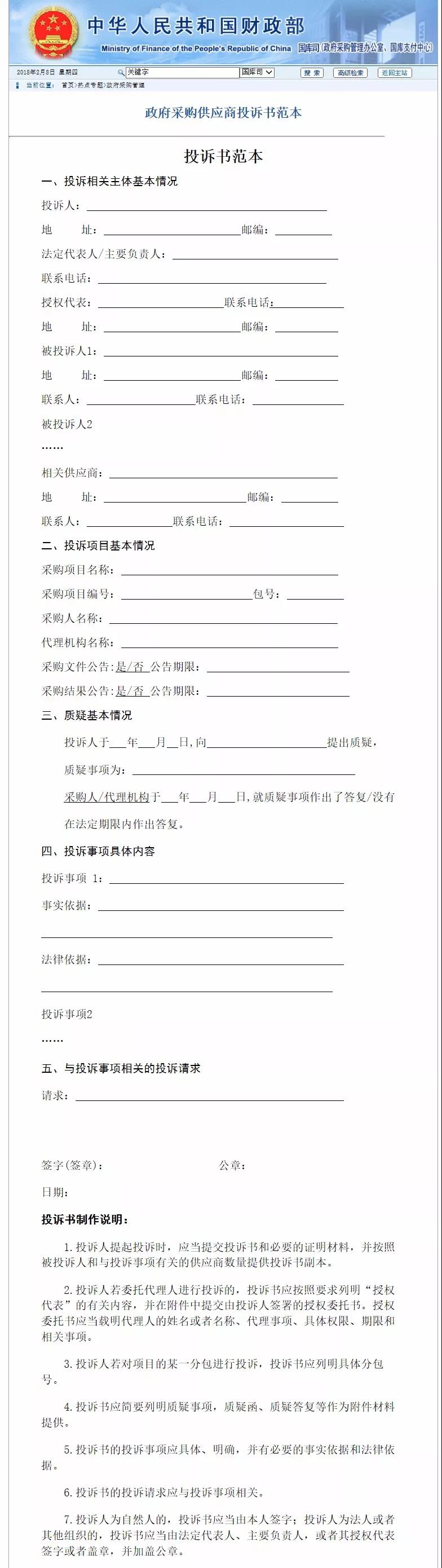 2月1日,財(cai)政(zheng)(zheng)部(bu)發布了《政(zheng)(zheng)府采(cai)購(gou)供應商質疑函(han)范(fan)本》和(he)《政(zheng)(zheng)府采(cai)購(gou)供應商投(tou)訴(su)書范(fan)本》,為3月1日即將實施的(de)(de)《政(zheng)(zheng)府采(cai)購(gou)質疑和(he)投(tou)訴(su)辦法(fa)》(財(cai)政(zheng)(zheng)部(bu)令第94號令)做好了準備。以后,全國(guo)政(zheng)(zheng)府采(cai)購(gou)項(xiang)目涉及到供應商質疑和(he)投(tou)訴(su)的(de)(de)均應采(cai)用這(zhe)兩個(ge)范(fan)本。